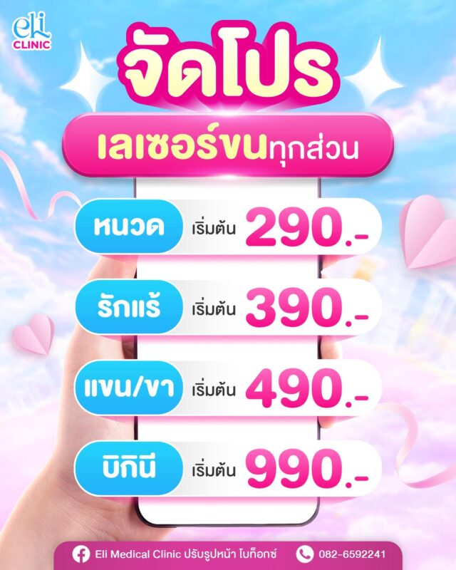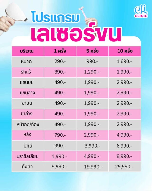 ตารางราคาและโปรโมชั่นเลเซอร์กำจัดขนที่ Eli Medical Clinic